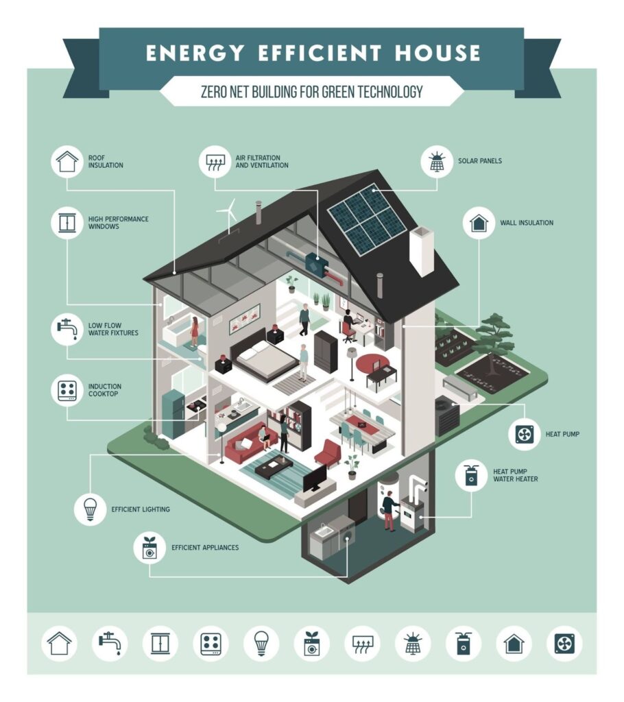 - Heat pump systems that use ambient heat for efficient warming and cooling.