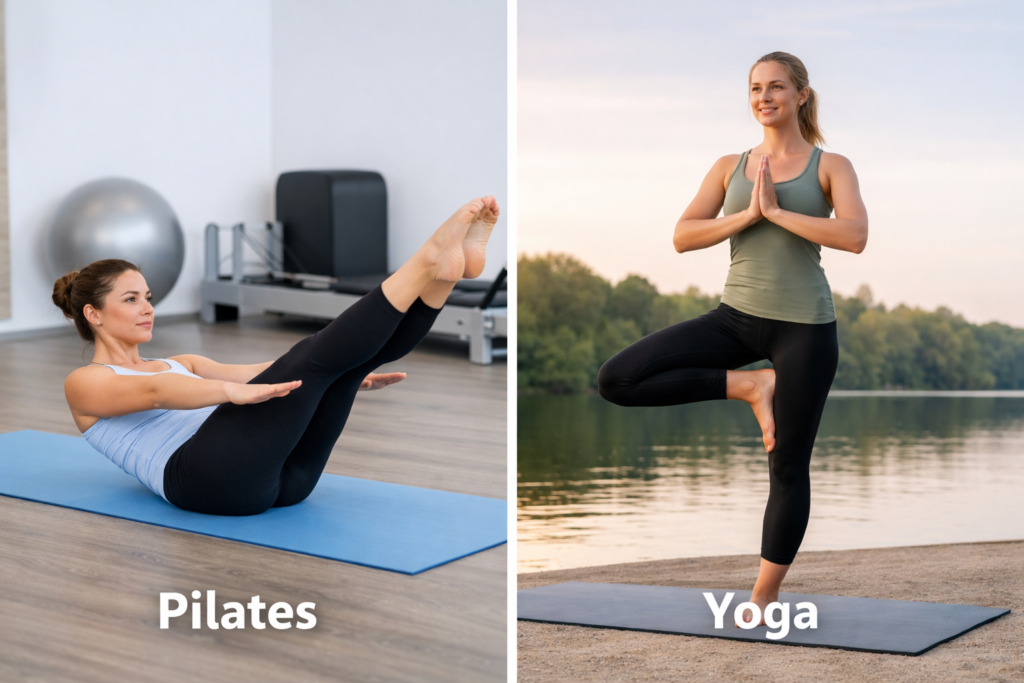• Pilates tends to focus more on muscular control, alignment, and core strength.